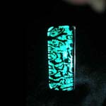 Beautiful etched blue tiger dichroic glass on heavy duty stainless steel. |